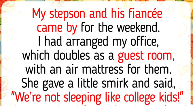 My stepson and his fiancée came over for the weekend. I prepared my guest room-turned-office for them to sleep in and inflated an air mattress. His fiancé smirked. “We’re not crashing like college kids!”. The next day, I was stunned to find them dragging their bags into my office anyway. My desk was covered with her makeup, and his shoes were on top of my files.