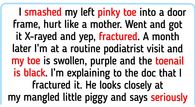 1.“I smashed my left pinky toe into a door frame, hurt like a mother. Went and got it X-rayed and yep, fractured.