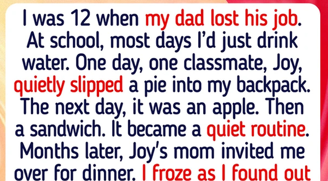 One day, one classmate, Joy, quietly slipped a pie into my backpack. The next day, it was an apple. Then a sandwich. It became a quiet routine. Months later, Joy’s mom invited me over for dinner.