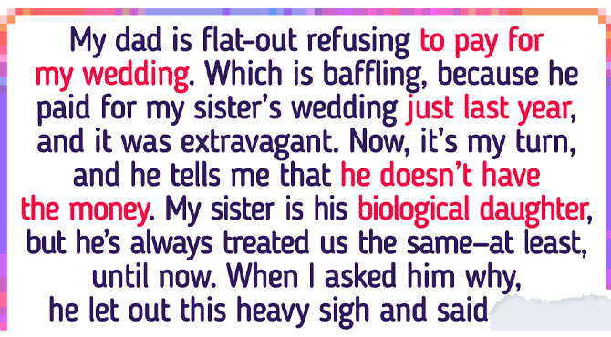 Now it’s my turn, and suddenly he claims he doesn’t have the money. My sister is his biological daughter, but he’s always treated us equally — at least, that’s how it’s been until now. When I asked him why, he just sighed deeply and said, “Look, your sister’s wedding cost me a small fortune. I didn’t expect to be paying for another one so soon.”