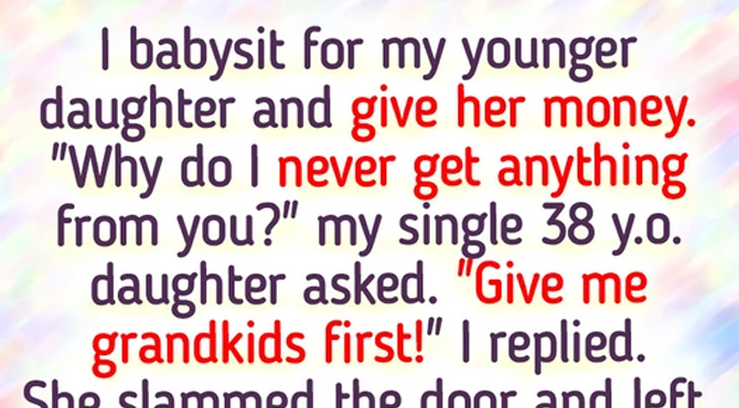 I babysit for my younger daughter and give her money. “Why do I never get anything from you?” my single 38-year-old daughter asked. “Give me grandkids first!” I replied.