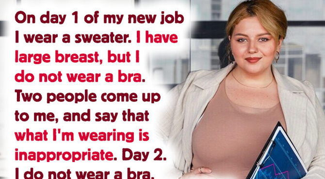 A woman finished her story with the question, hoping to get a view from the side: “For the two years I spent at my prev office, I did not wear a bra once. I usually wore sweaters or T-shirts or blouses, most of the time, along with a jacket. Even though I may have large breasts, I did not see it as inappropriate or a problem. Am I wrong here?”