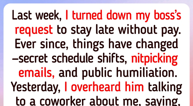 The kicker was yesterday. I walked by his office and overheard him talking to one of my coworkers. Clear as day, he said he was going to “make her regret it.” That was about me. Imagine hearing your boss plotting to make your life harder just because you didn’t stay late for free.