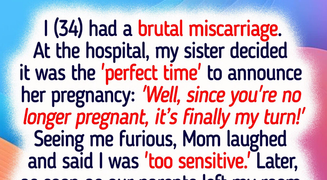 I (34) had a brutal miscarriage. At the hospital, my sister decided it was the ’perfect time’ to announce her pregnancy. She said, “Well, since you’re no longer pregnant, it’s finally my turn!” Seeing me furious, mom laughed and said I was ’too sensitive.’