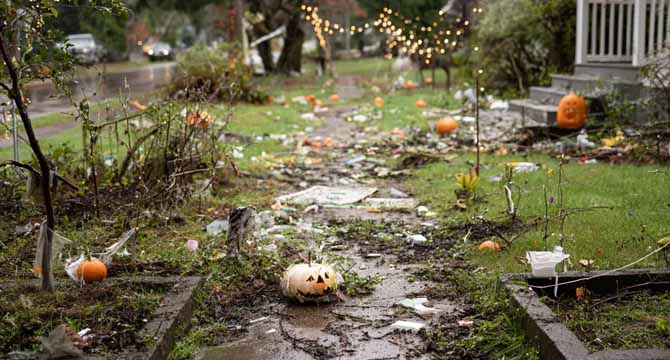 Our pumpkins were smashed into orange mush all over the driveway and walkway. The cobwebs were ripped down and scattered across the lawn. The string lights were torn apart, with broken bulbs glittering on the ground like dangerous confetti.
