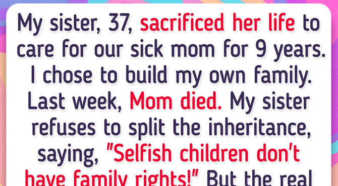 My name is Wendy. I am a 35-year-old mother of 8-year-old twin boys. Cynthia, my sister, 37, sacrificed her life to care for our sick mom for 9 years. I chose to build my own family. Last week, Mom died. My sister refuses to split the inheritance, saying, “Selfish children don’t have family rights!” But the real surprise came when I discovered that, before she died, our mother had signed legal documents leaving everything to my sister.