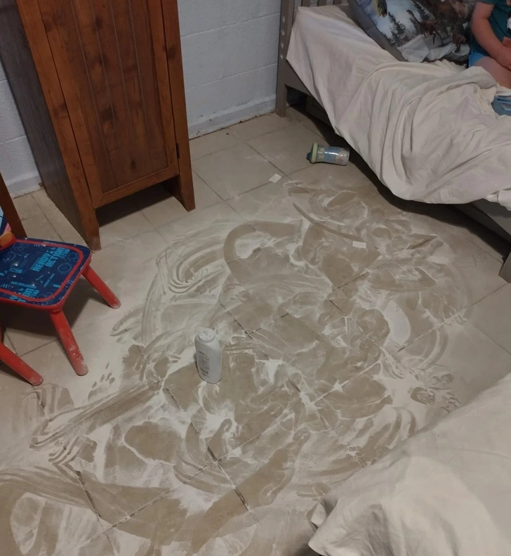 “Son was being too quiet last night, so I went to check on him and found this masterpiece made out of baby powder on the floor.”