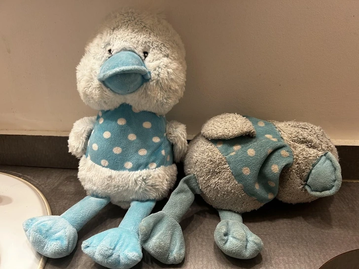 “Life before and after kids. As demonstrated by my toddler’s well-loved Ducky and new backup Ducky”