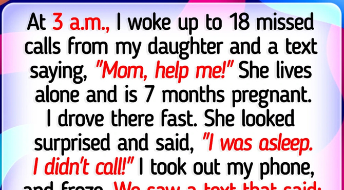 At 3 a.m., I woke up to 18 missed calls from my daughter and a text saying, “Mom, help me!” She lives alone and is seven months pregnant. I drove over there as fast as I could. She looked surprised and said, “I was asleep. I didn’t call!”