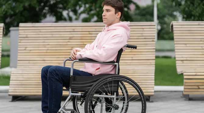 A wheelchair rolled into view.