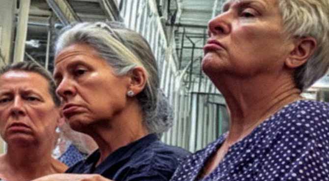 We found her pressed against a table, clutching a paper bag, surrounded by six older women.
