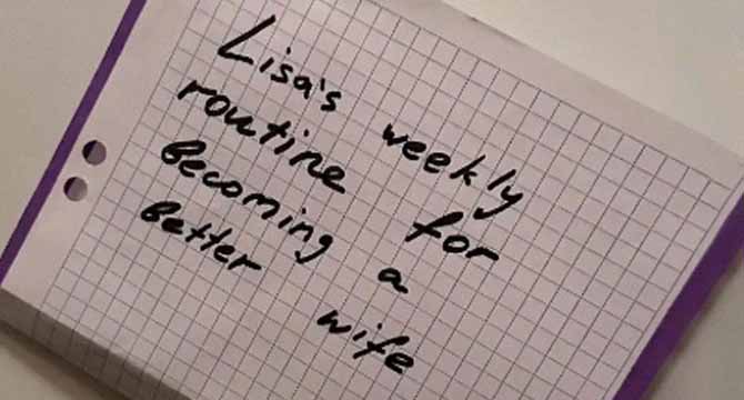 I stared at the paper in front of me. It was a schedule… and he’d written “Lisa’s Weekly Routine for Becoming a Better Wife” at the top in bold.