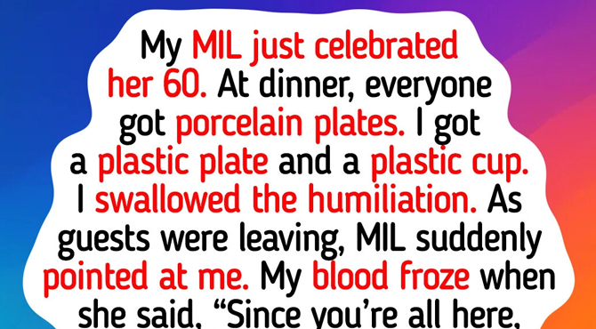 For my MIL’s 60th birthday, I bought her an expensive gift. My husband was abroad for work, so I came alone. At dinner, everyone got porcelain plates. Except me. I was given a plastic plate and a plastic cup. I swallowed it and stayed quiet. As people were getting ready to leave, my MIL suddenly pointed at me and said loudly, “Tell them why you’re broke but still bought me such an expensive gift. A real cashmere shawl I’ve wanted for years. The answer is simple — because you actually care.” Then she turned to the rest of the family. “The plastic plate wasn’t humiliation. It was a test. Not one of you asked why she was treated differently. Not one of you stood up for her. You were too busy with your pride. That tells me exactly who I can trust.”