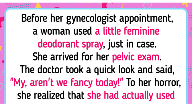• A woman had a gynecologist appointment one afternoon. Before leaving home, she used a little feminine deodorant spray, just in case.