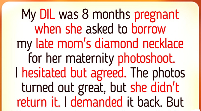My DIL was about 8 months pregnant a few months ago and asked if she could borrow my late mom’s diamond necklace for a maternity photoshoot. This necklace is the heirloom. My mom wore it on special occasions, and it’s one of the few things I have left of her.