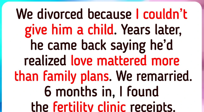 We divorced because I couldn’t give him a child. Years later, he came back softer, kinder, saying he’d realized love mattered more than family plans. We remarried. Six months in, he asked if I’d ever considered getting tested again, just to “have answers.” That’s when I found the fertility clinic receipts. My heart froze when he told me he had a child from the years we were apart. He wasn’t checking if I could give him something. He was trying to see if I could love him now that he already had it.