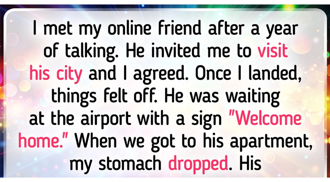 I met my online friend after a year of talking. He invited me to visit his city and I agreed. Once I landed, things felt off. He was waiting at the airport with a sign “Welcome home.” When we got to his apartment, my stomach dropped. His living room was covered in pictures of me.