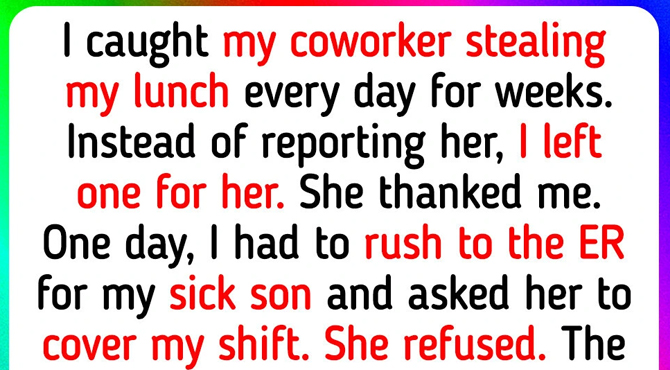 I caught my coworker stealing my lunch every day for weeks. Instead of reporting her, I left one for her. She thanked me. One day, I had to rush to the ER for my sick son and asked her to cover my shift. She refused. The next day, I gasped to find she had used her lunch breaks for two weeks straight to cover parts of my workload so nothing piled up while I was gone. She told our boss to dock her hours instead of mine. I discovered it when I noticed her clocking out late every single day that month.