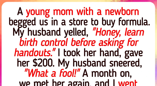 A young mom with a newborn begged us in a store to help her buy formula. My husband scoffed, “Maybe learn birth control before asking for handouts.” I ignored him, took her hand, and gave her $200. He laughed and called me a fool.