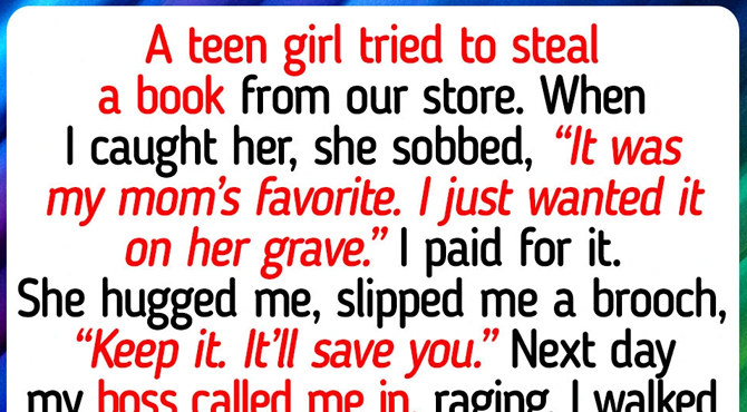 A teen girl tried to steal a book from our store. When I caught her, she sobbed, “It was my mom’s favorite. I just wanted it on her grave.” I paid for it. She hugged me and slipped me a brooch. “Keep it. It’ll save you.” Next day, my boss called me in, furious. My blood ran cold when I saw him watching the security footage: me letting the girl go with the book instead of calling the police. He didn’t even listen to my explanation. Fired. I felt strangely relieved; working for him had never been a joy.