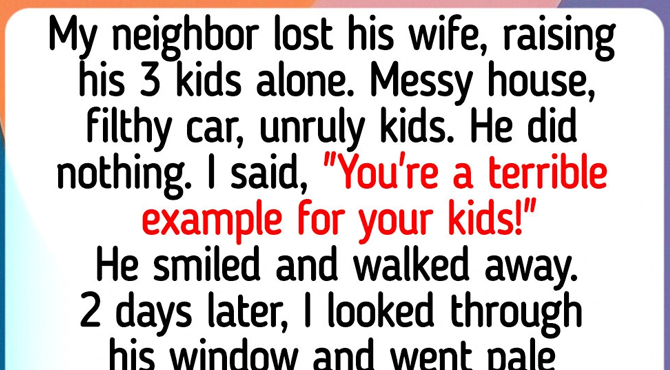 My neighbor lost his wife, raising his 3 kids alone. Messy house, filthy car, unruly kids. He did nothing. I sneered, “You’re a terrible example for your kids!” He smiled and walked away.