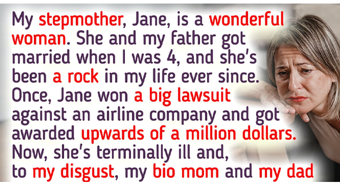 The woman opened her post, saying, [edited], “My stepmother, Jane, is a wonderful woman. She and my father got married when I was 4, and she’s been a rock in my life ever since. Once, Jane won a big lawsuit against an airline company and got awarded upwards of a million dollars. Now, she’s terminally ill and, to my disgust, my bio mom and my dad are behaving very cruelly towards her, and they want to inherit her money by all means.”