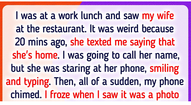 I was at a work lunch and saw my wife there at the restaurant. It was weird because 20 minutes ago, she had texted me saying that she was home. I was going to call her name, but she was staring at her phone, smiling and typing, so I silently watched her. Then, all of a sudden, my phone chimed.