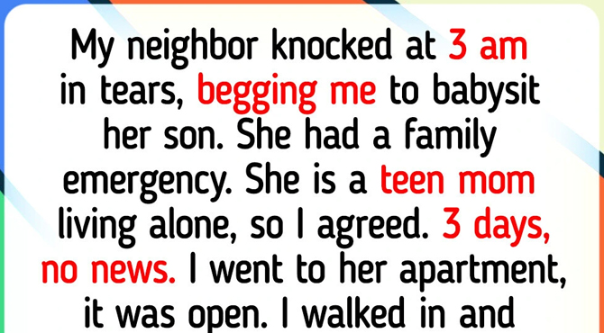 My neighbor knocked at 3 am in tears, begging me to babysit her son. She had a family emergency. She is a teen mom living alone, so I agreed.