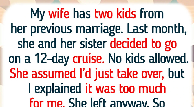 But here’s the issue: last month, she and her sister decided to go on a 12-day cruise. No kids allowed. My wife basically announced she was going and then just assumed I’d take care of the kids while she was gone.