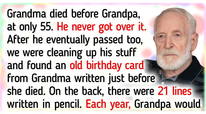 My grandma died before Grandpa. She was only 55. He never got over it. After he eventually passed too, we were cleaning up his stuff and found an old birthday card from Grandma written just before she died. On the back, there were 21 lines written in pencil.