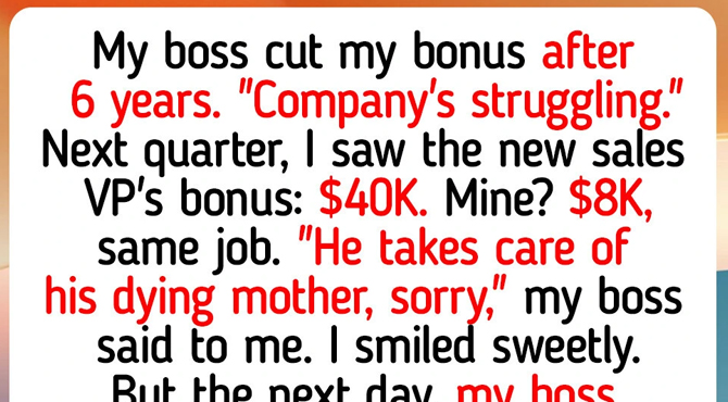Then, the quarterly report leaked. I saw the new VP’s bonus: $40K. I had brought in triple the clients he had. When I confronted my boss, he didn’t even have the decency to look guilty. He just said calmly, “He takes care of her dying mother, sorry. You’re at your ceiling anyway.”