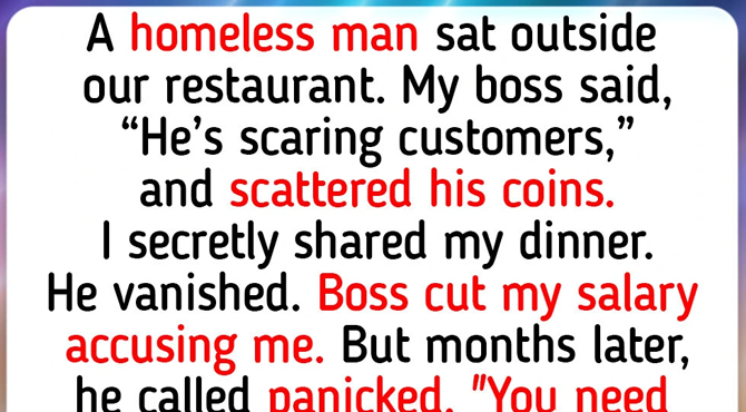 A homeless man sat outside our restaurant every night. My boss said, “He’s scaring customers,” and scattered his coins. I secretly shared my dinner with him. He took it and disappeared. My boss cut my salary accusing me.