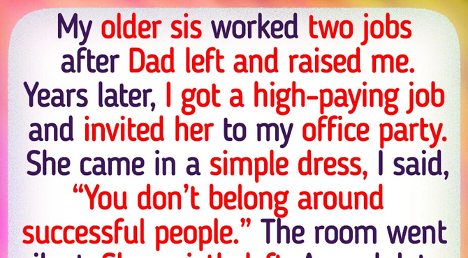 My older sis 18 worked two jobs after our dad left. She raised me. Years later, I got a high-paying job and invited her to my office party. She showed up in a simple dress. I felt embarrassed. I said, “You don’t belong around successful people.” The room went dead silent. She didn’t argue. She just quietly left. A week later, my boss called me in. I thought I was about to be fired. Instead, he told me he’d spoken to my sister that night.