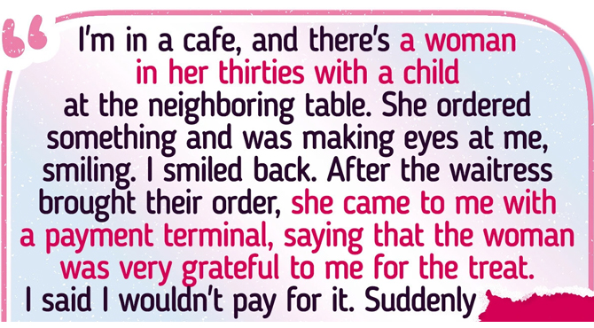 I’m in a cafe, and there’s a woman in her thirties with a child at the neighboring table. She ordered something and was making eyes at me, smiling. I smiled back. After the waitress brought their order, she came to me with a payment terminal, saying that the woman was very grateful to me for the treat. I said I wouldn’t pay for it.