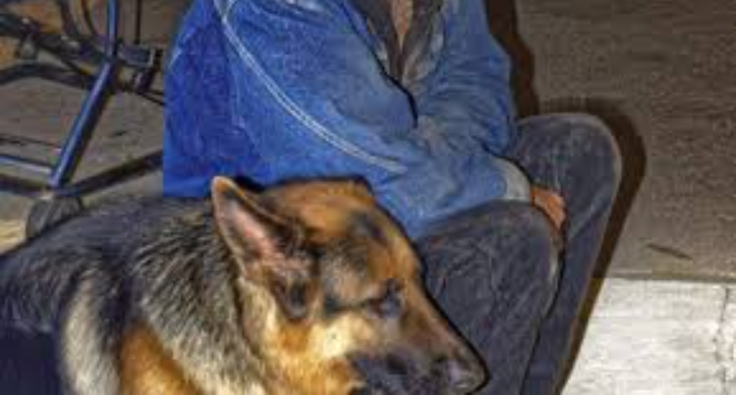 Next to him curled a large German Shepherd, pressed against his side like a living shield. The dog was groomed and looked well-fed and loved.