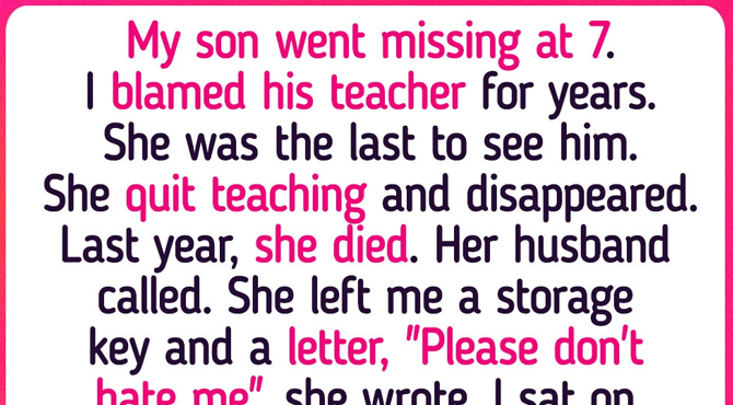 For six years, I blamed my son’s teacher, Mrs. Alder, for the day he went missing aged 7. She was the last adult to see him. I made her life hell, publicly, repeatedly, without mercy. She never fought back. Never sued me. Just quietly left teaching and disappeared. Last year she died. Her husband called me because she’d left me something in her will. It was a storage unit key and a letter asking me not to hate her for what I’d find inside. Inside were six years of private investigation files: receipts, maps, contacts, and dead ends. She had spent every penny of her savings hiring people to look for my son after the police gave up. There was also a folder of every birthday and Christmas card she’d written him but never sent. At the bottom was a photo of him from his last school day, laughing at something off-camera. She wrote on the back: “He was so happy that morning. I need you to know that.”