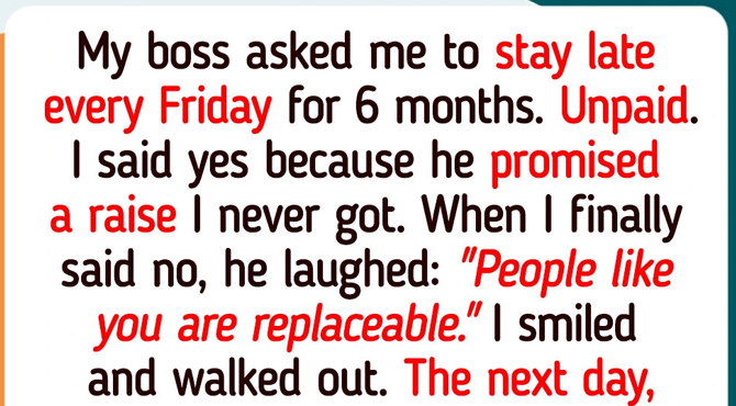 One afternoon my boss pulled me aside and asked for a small favor—to stay late every Friday for 6 months. Unpaid. I said yes because he promised a raise I never got.