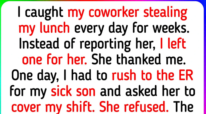 I caught my coworker stealing my lunch every day for weeks. Instead of reporting her, I left one for her. She thanked me. One day, I had to rush to the ER for my sick son and asked her to cover my shift. She refused. The next day, I gasped to find she had used her lunch breaks for two weeks straight to cover parts of my workload so nothing piled up while I was gone. She told our boss to dock her hours instead of mine. I discovered it when I noticed her clocking out late every single day that month.