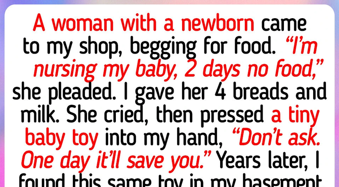 A woman with a newborn came to my shop, begging for food. “I’m nursing my baby, 2 days no food,” she pleaded. I gave her 4 breads and milk. She cried, then pressed a tiny baby toy into my hand, “Don’t ask. One day it’ll save you.”