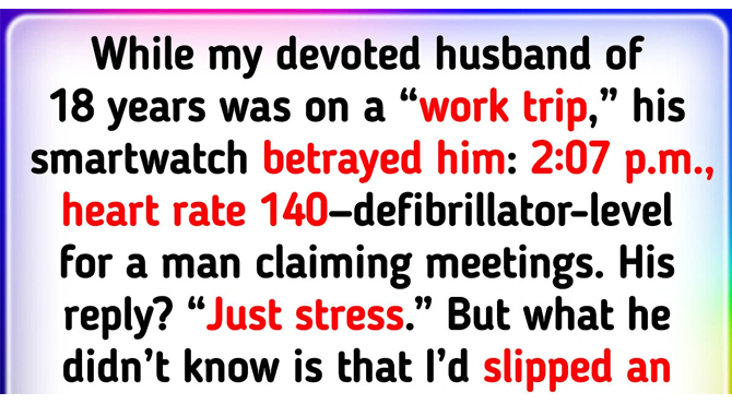 While my devoted husband of 18 years was on a “work trip,” his smartwatch betrayed him: 2:07 p.m., heart rate 140—defibrillator-level for a man claiming meetings. His reply? “Just stress.” But what he didn’t know is that I’d slipped an AirTag into his suitcase. The tracker pulsed at a boutique hotel’s rooftop bar… where his “colleague” lounged in a sundress. 18 years of shatterproof trust—gone. Now my tires screech toward Room 214, clawing between truth and lies.