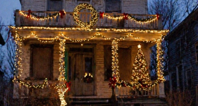 There was a faded wreath with little bells, which hung crookedly on the front door. There were the familiar plastic candy canes lining the path to the house.