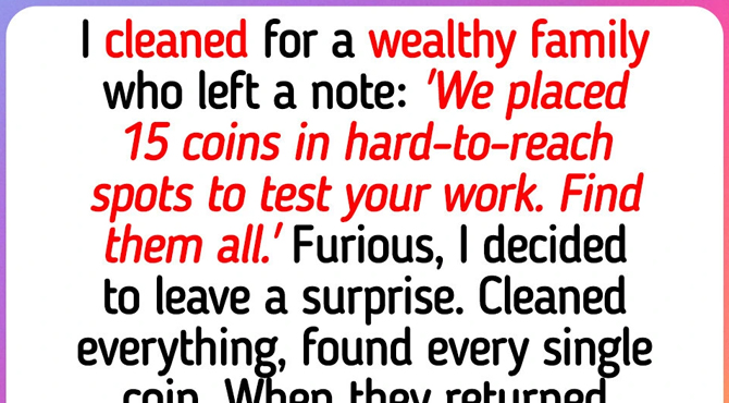 I clean houses for a living. One of my regulars is a wealthy family in a big house that takes me a full day to get through.I’ve seen a lot but when I read that note on the kitchen counter I was furious. “We placed 15 coins in hard-to-reach spots to test your work. Find them all.” Like I was a student who needed grading. I decided right there to leave them a surprise. I cleaned every inch of that house, behind radiators, tops of door frames, under furniture feet, inside the light fixture I technically wasn’t supposed to touch. Found all fifteen coins. Stacked them in a perfect pile in the center of the kitchen table with my invoice underneath and a note that said “all 15, feel free to check.” Then I found their feedback form they’d left in the drawer, filled it out myself, and left it on top.